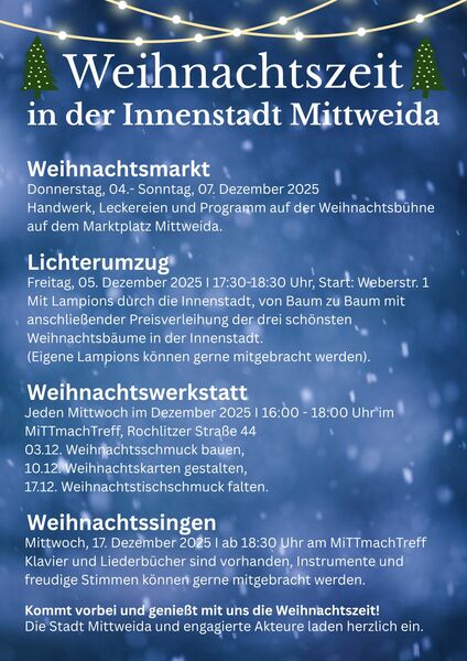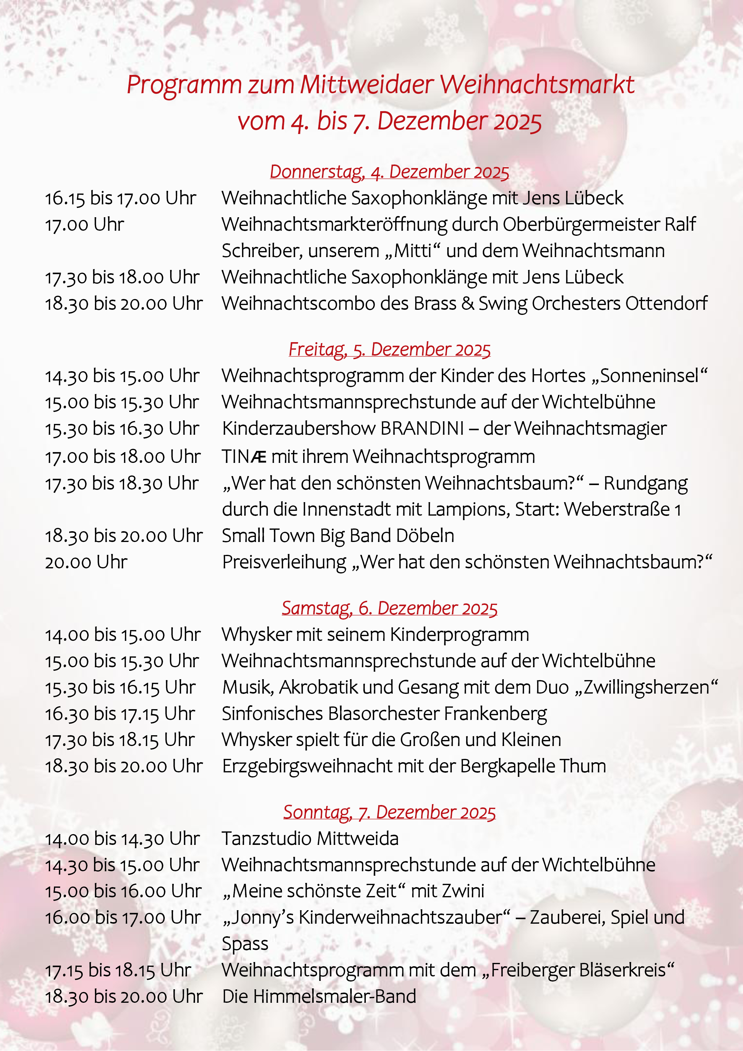 Am Freitag, dem 5. Dezember 2025, laden wir herzlich zum weihnachtlichen Stadtrundgang ein. Zwischen 17.30 und 18.30 Uhr werden die geschmückten Bäume in der Innenstadt gemeinsam begutachtet. Startpunkt ist im Durchgang der Weberstaße 1. Anschließend findet die Preisverleihung auf dem Mittweidaer Weihnachtsmarkt um 20.00 Uhr statt.